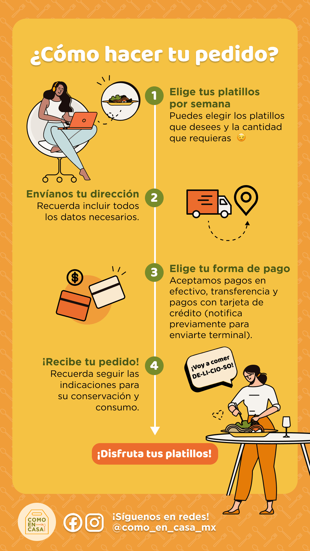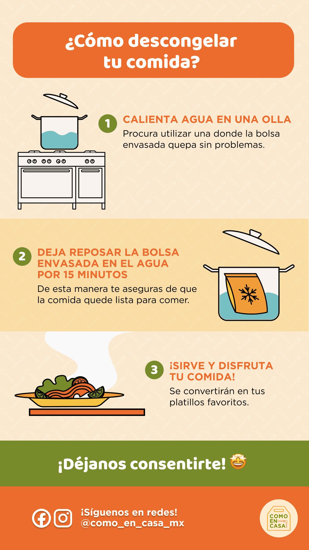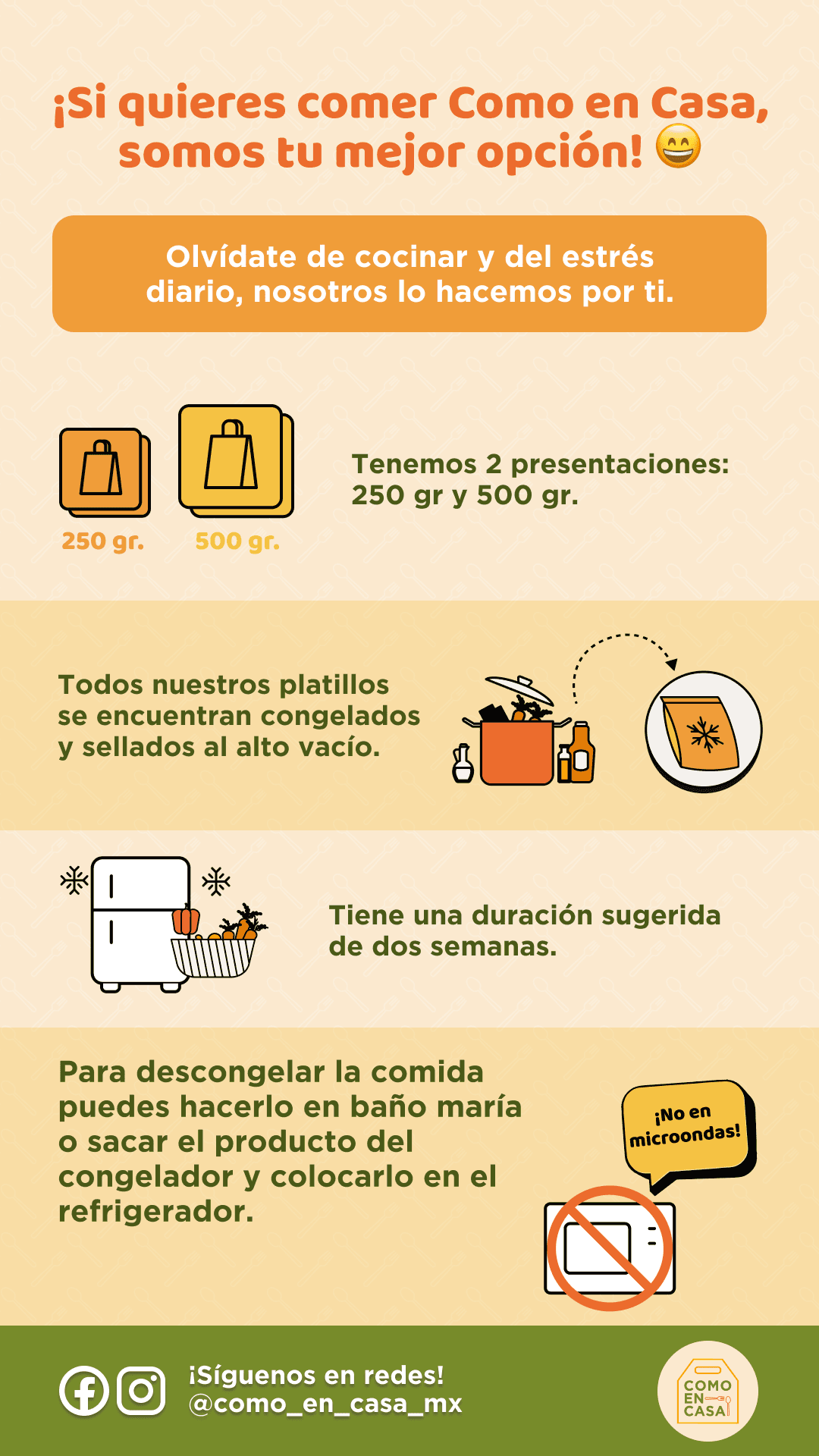Como en Casa es un emprendimiento con sede en la ciudad de Puebla, México. Se especializa en ofrecer un servicio de comida preparada y sellada al vacío, diseñada para que los clientes puedan disfrutar de platos caseros con tan solo calentarlos durante unos minutos.