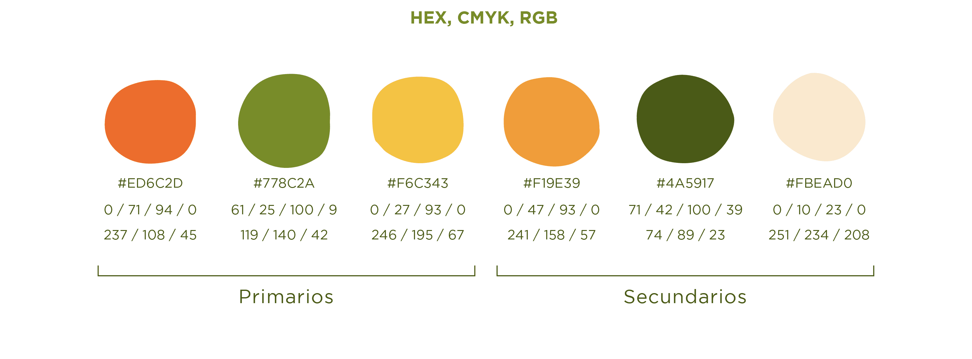Para complementar estos tonos principales, se incorporaron colores secundarios: otro tono de naranja para crear contrastes visuales, un verde oliva oscuro para resaltar títulos y contrastes, y un tono beige para su uso en fondos.