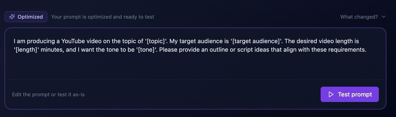 Once optimized, the prompt transitions into a new state where it is considered ready to be tested. At this point, the primary CTA changes to Test prompt, making it explicit that the prompt has been structurally improved and can now be validated through real interaction with the model.