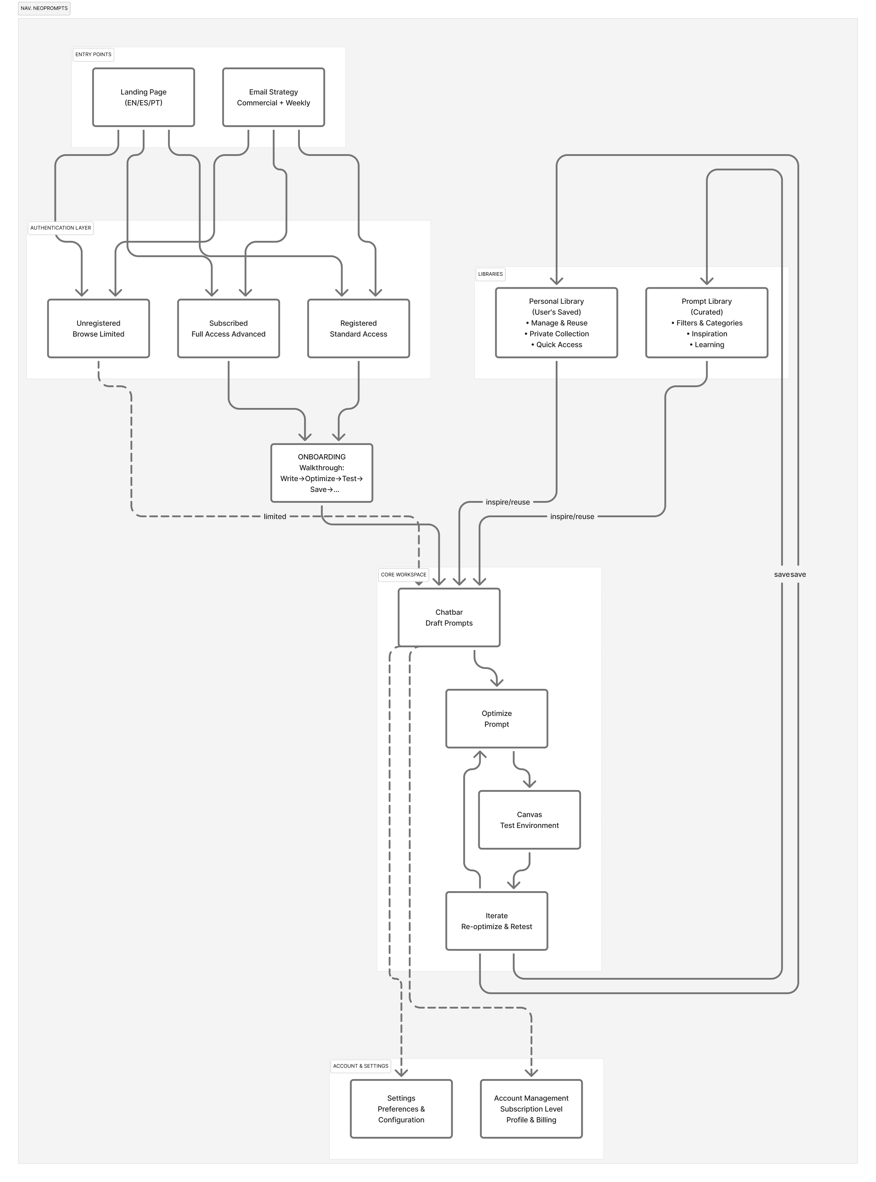The information architecture was designed to keep users in a single cognitive loop: draft → optimize → test → iterate. Supporting areas (library, personal library, settings) are structured to reduce context switching and make prompts easy to find and reuse.