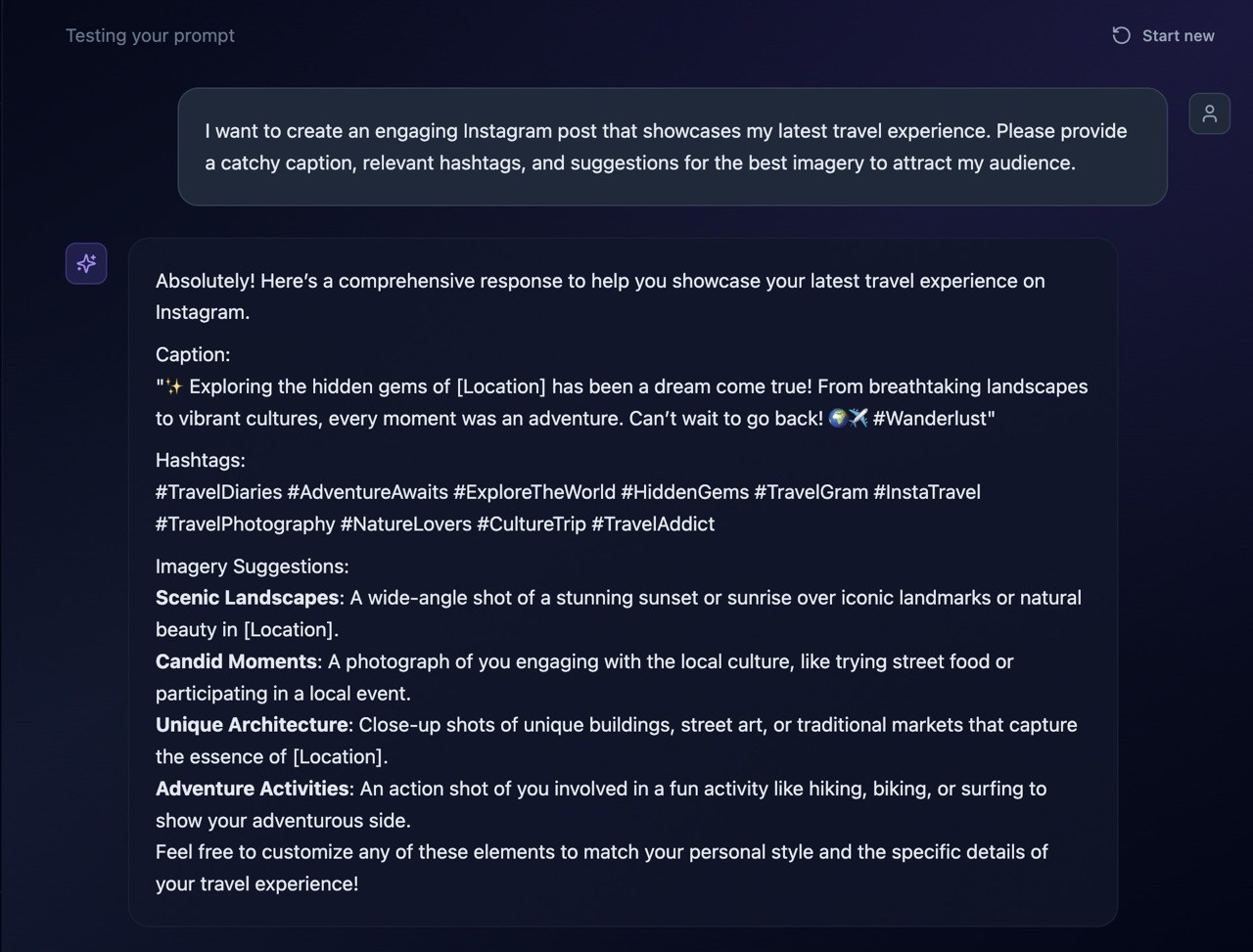 When a user selects Test prompt, the optimized prompt is injected into the canvas as if it were written by the user, preserving authorship and reinforcing that the prompt still belongs to them. The AI then responds using that prompt as system-level context, mirroring how tools like ChatGPT operate in real-world usage.