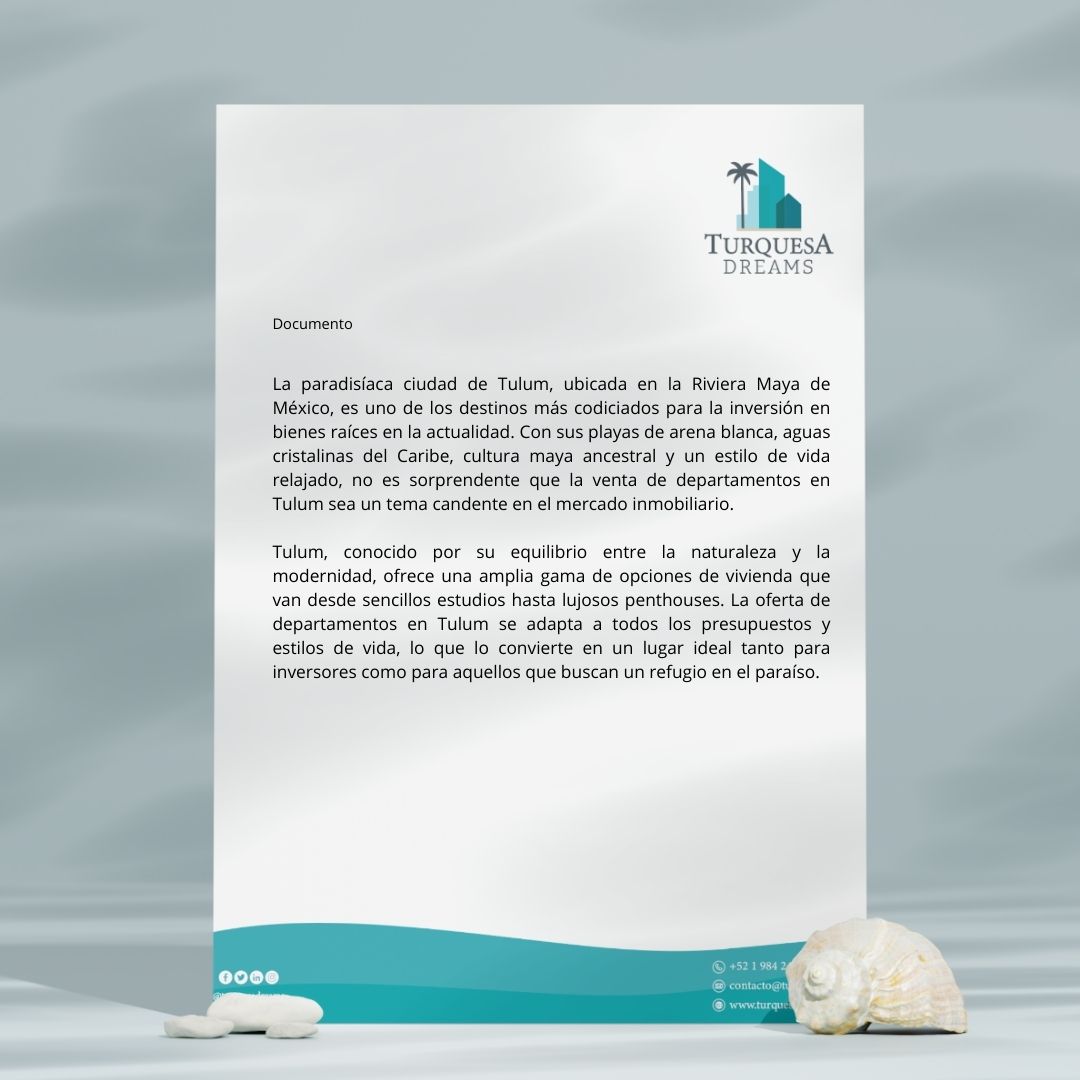 Turquesa Dreams es una empresa que se esfuerza por proyectar una imagen amigable, profesional y confiable, en perfecta sintonía con la esencia de Tulum, el lugar que alberga algunas de las playas más deslumbrantes de México.